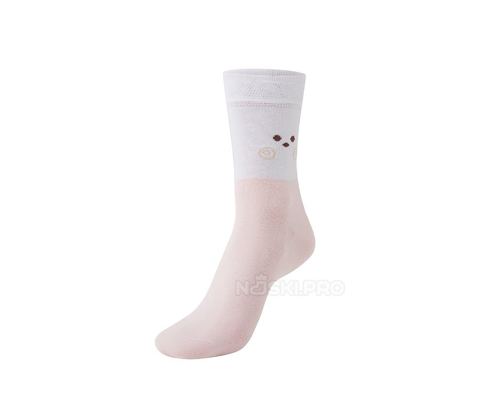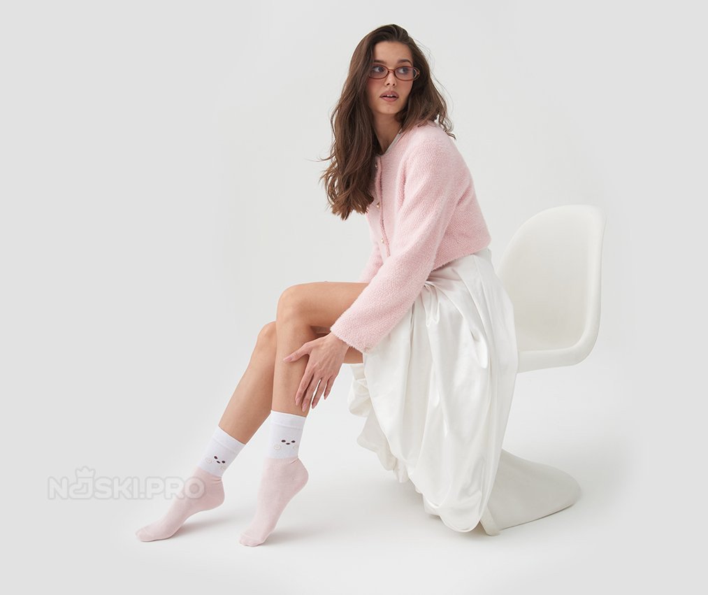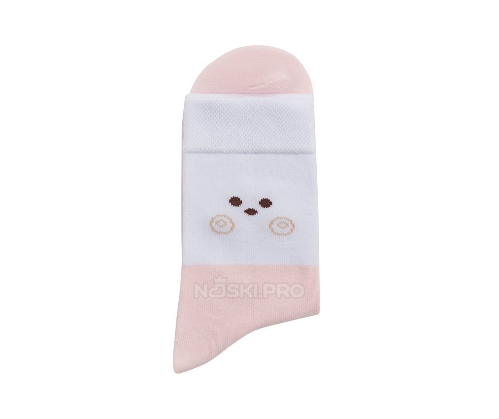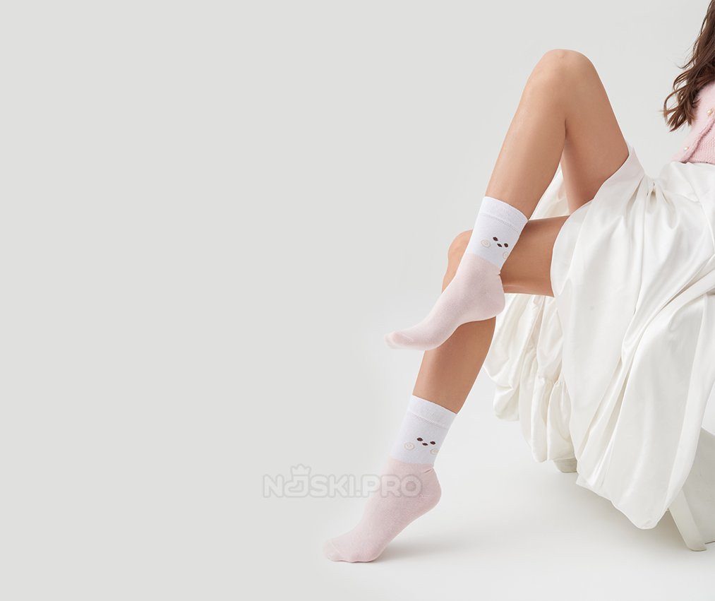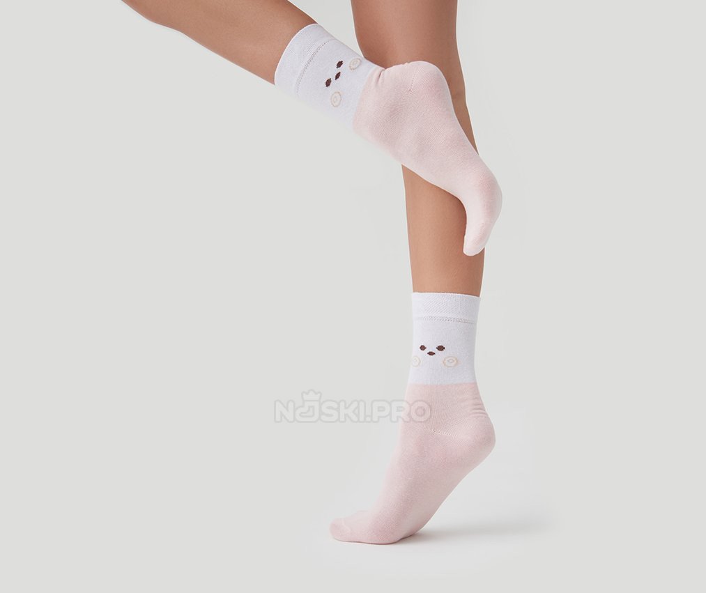 Модель выполнена в нежной цветовой гамме: нижняя часть светло-персиковая, верхняя — белая с вышитым милым личиком (глазки и щёчки), создающим образ маленькой зверюшки. Такой дизайн понравится тем, кто любит аккуратные, игривые и «уютные» детали в своём образе. Эти носки подойдут как для повседневной носки, так и для создания домашнего комфортного стиля.