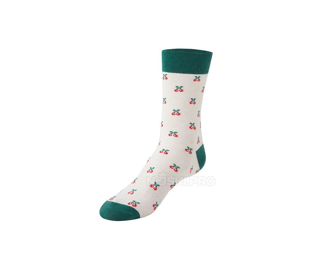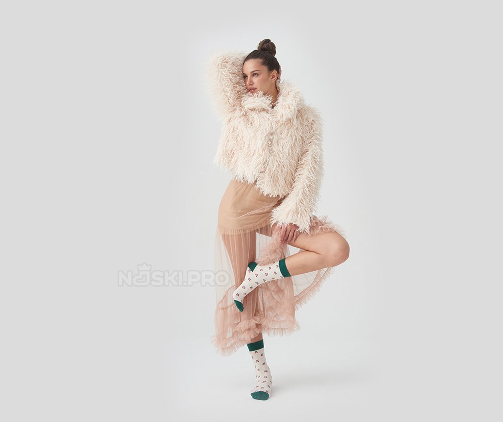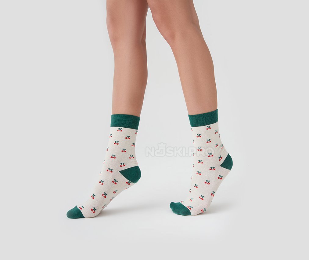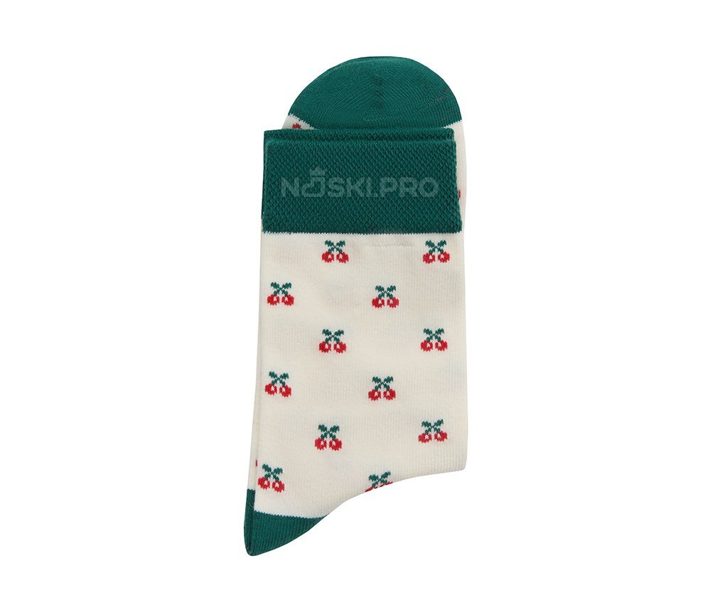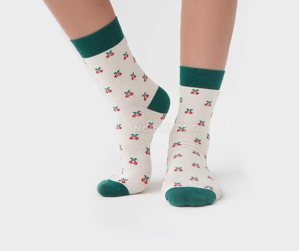 Модель выполнена на светло-бежевом фоне, украшенном ярким вишнёвым принтом, равномерно распределённым по всей поверхности. Контрастные тёмно-зелёные элементы на манжете, пятке и мысе создают выразительный акцент и делают образ завершённым и стильным. Такие носки отлично подойдут как для повседневной носки, так и для создания уютного домашнего образа.