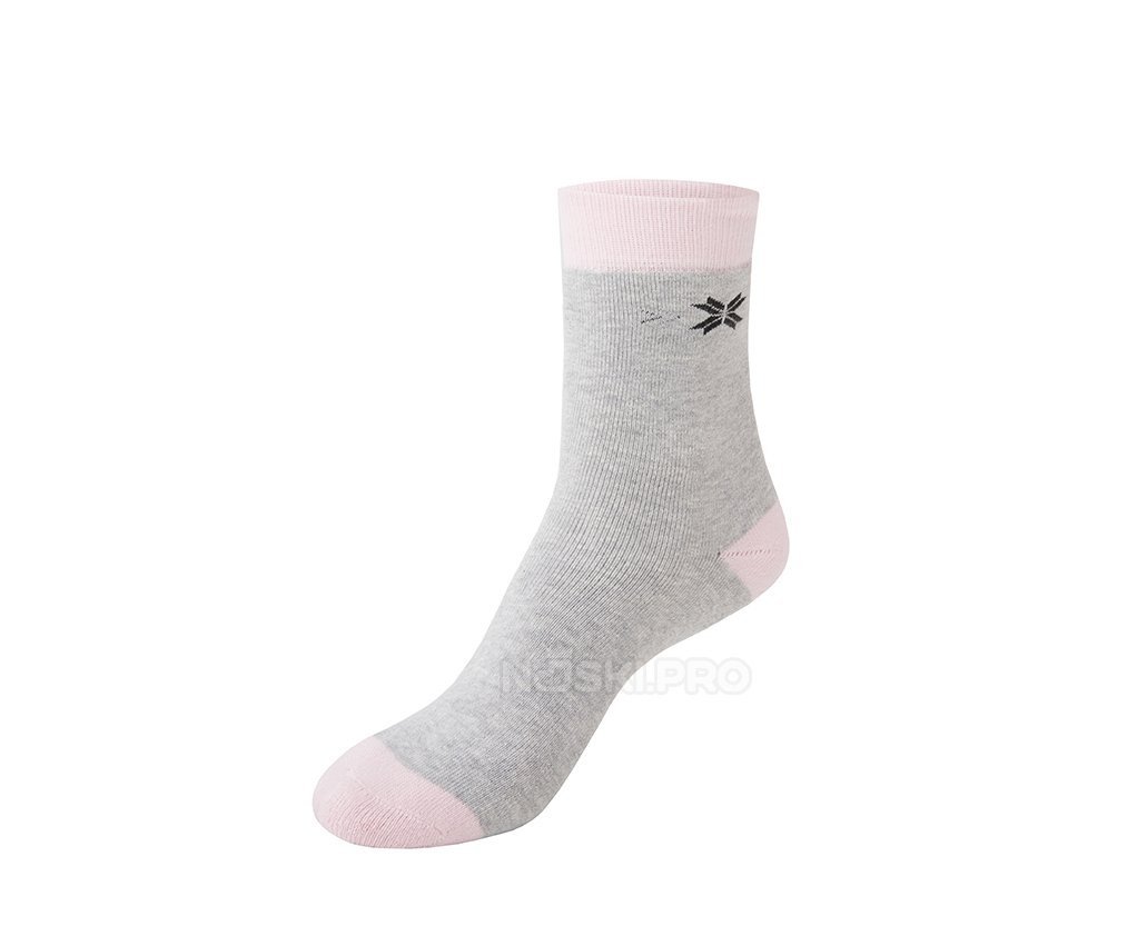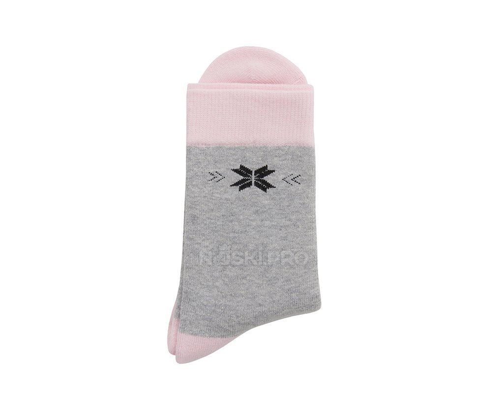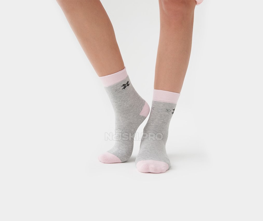 Модель выполнена в светло-сером меланже с розовыми вставками на пятке, мысе и манжете. Аккуратный чёрный узор в виде снежинки добавляет выразительный декоративный акцент, создавая стильный и уютный зимний образ. Носки хорошо сочетаются с различной одеждой и подходят для ежедневного использования.