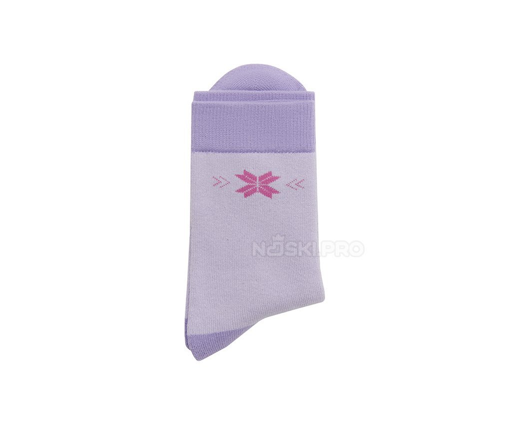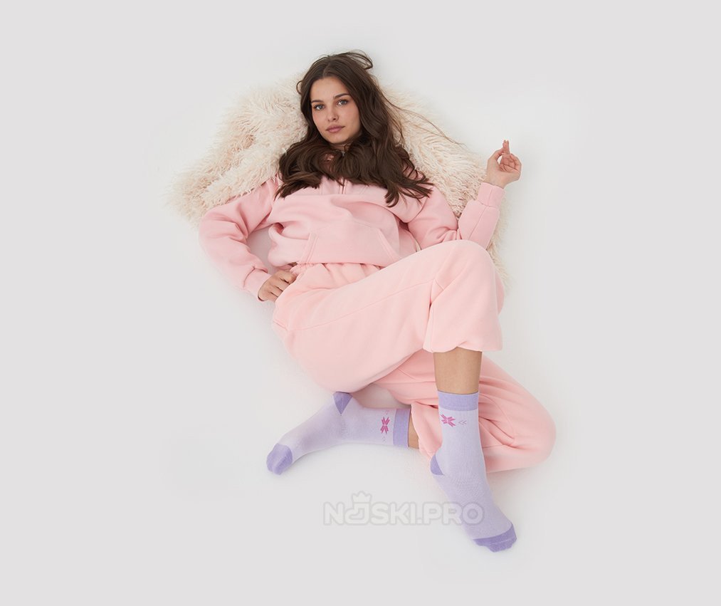Модель выполнена в светло-сиреневом цвете с фиолетовыми вставками на пятке, мысе и манжете. Розовый узор в виде снежинки добавляет аккуратный декоративный акцент, подчёркивая мягкость и уютный стиль носков. Такая расцветка гармонично смотрится и легко сочетается с домашней и повседневной одеждой.